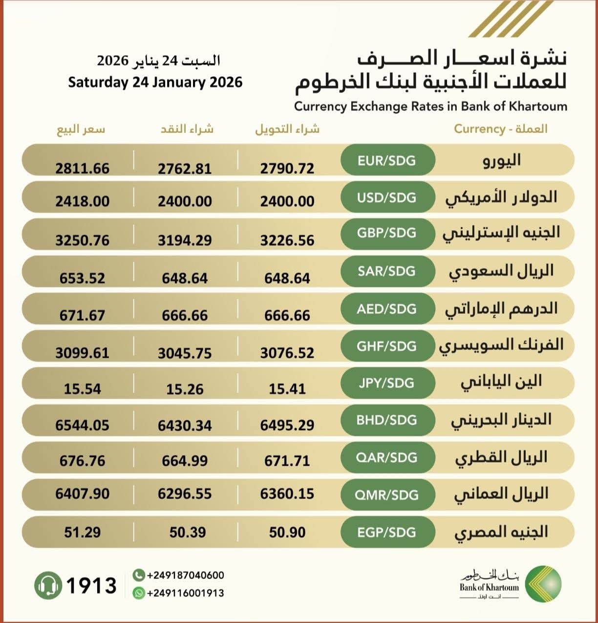 أصدر  بنك الخرطوم ، اليوم السبت 24 يناير 2026، نشرة أسعار صرف العملات الأجنبية مقابل الجنيه السوداني، والتي أوضحت أسعار الشراء والتحويل والبيع لمجموعة من العملات العالميةا والعربية، وسط متابعة مستمرة من المتعاملين في السوق المصرفي.
