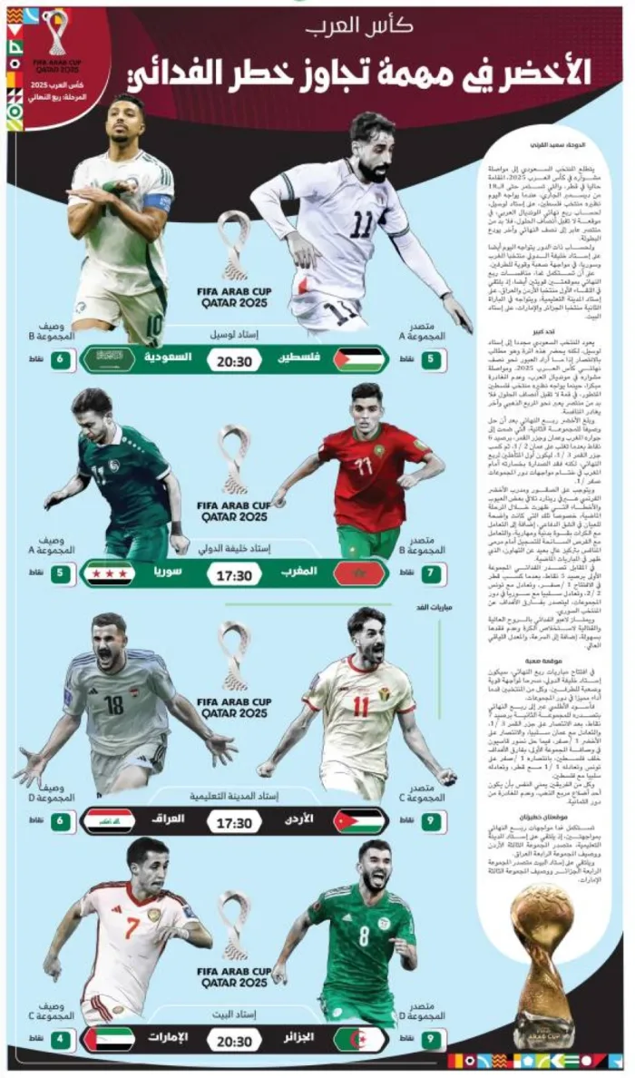 يعود المنتخب السعودي مجددا إلى إستاد لوسيل، لكنه يحضر هذه المرة وهو مطالب بالانتصار إذا ما أراد العبور نحو نصف نهائي كأس العرب 2025، ومواصلة مشواره في مونديال العرب، وعدم المغادرة مبكرا، حينما يواجه نظيره منتخب فلسطين المتطور، في قمة لا تقبل أنصاف الحلول فلا بد من منتصر يعبر نحو المربع الذهبي وآخر يغادر المنافسة.