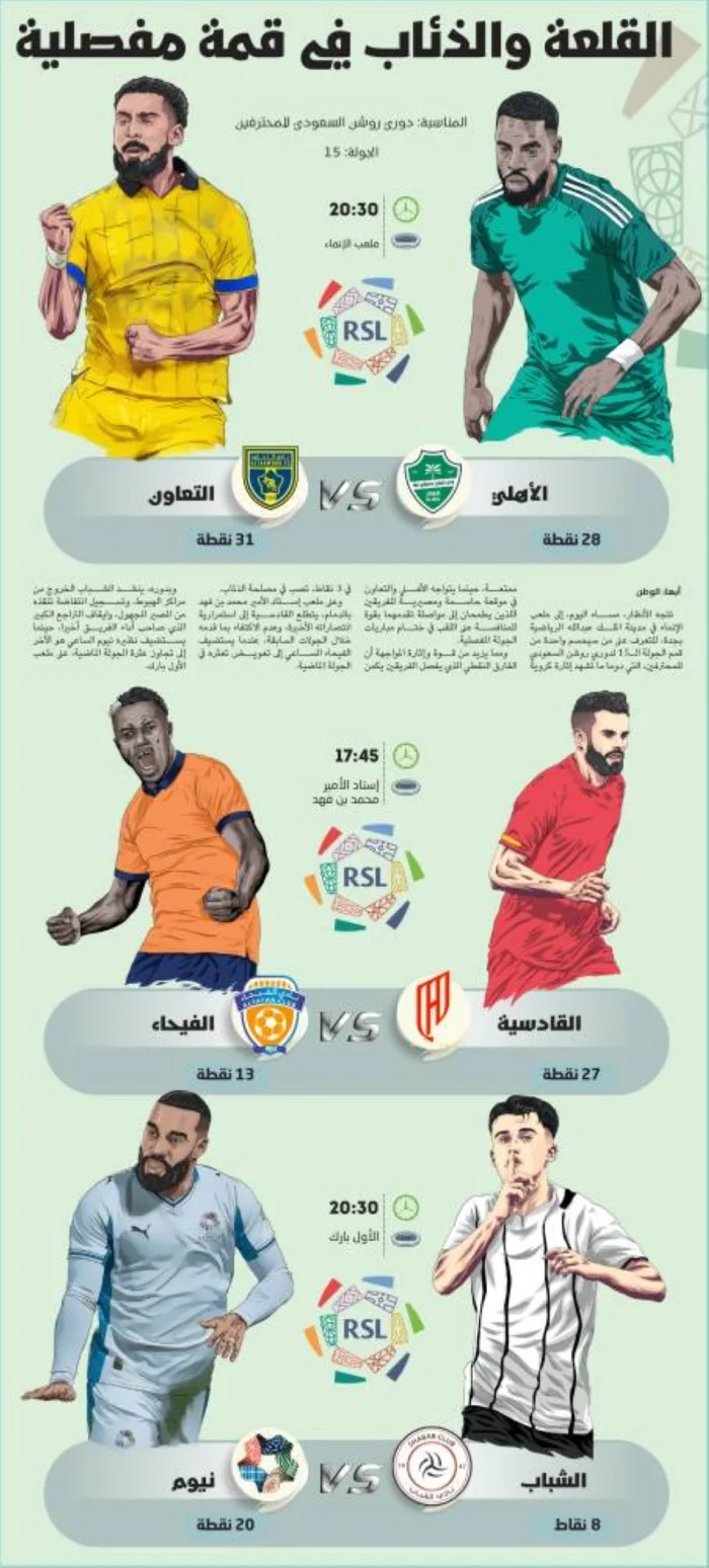تتجه اﻷنظار، مساء اليوم، إلى ملعب الإنماء في مدينة الملك عبدالله الرياضية بجدة، للتعرف على من سيحسم واحدة من قمم الجولة الـ15 لدوري روشن السعودي للمحترفين، التي دوما ما تشهد إثارة كروية ممتعة، حينما يتواجه اﻷهلي والتعاون في موقعة حاسمة ومصيرية للفريقين اللذين يطمحان إلى مواصلة تقدمهما بقوة للمنافسة على اللقب في ختام مباريات الجولة المفصلية.
