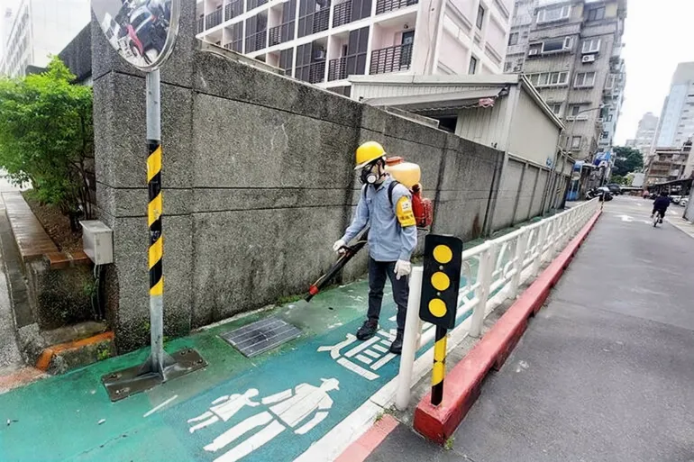 يقوم أحد موظفي حكومة مدينة تايبيه، يوم الجمعة، برشّ مواد مطهِّرة للحد من انتشار فيروس هانتا.- المصدر: إدارة الصحة في مدينة تايبيه