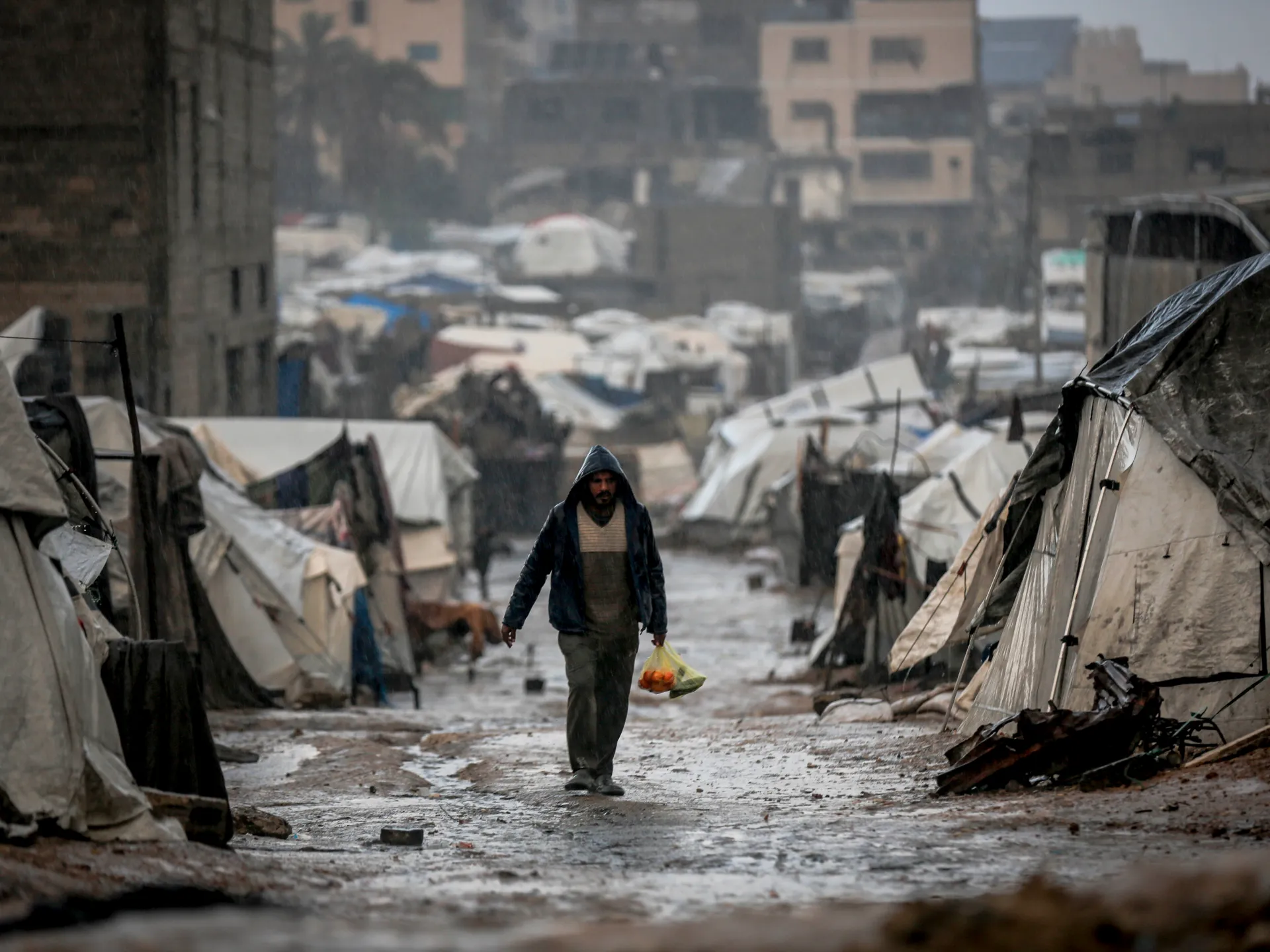 توفيت شابة فلسطينية، اليوم الأحد، إثر سقوط جدار على خيمتها في حي الرمال غربي مدينة غزة، في حين تسببت مياه الأمطار والرياح العاصفة التي تضرب القطاع منذ مساء السبت، بغرق وتطاير آلاف خيام النازحين الفلسطينيين.